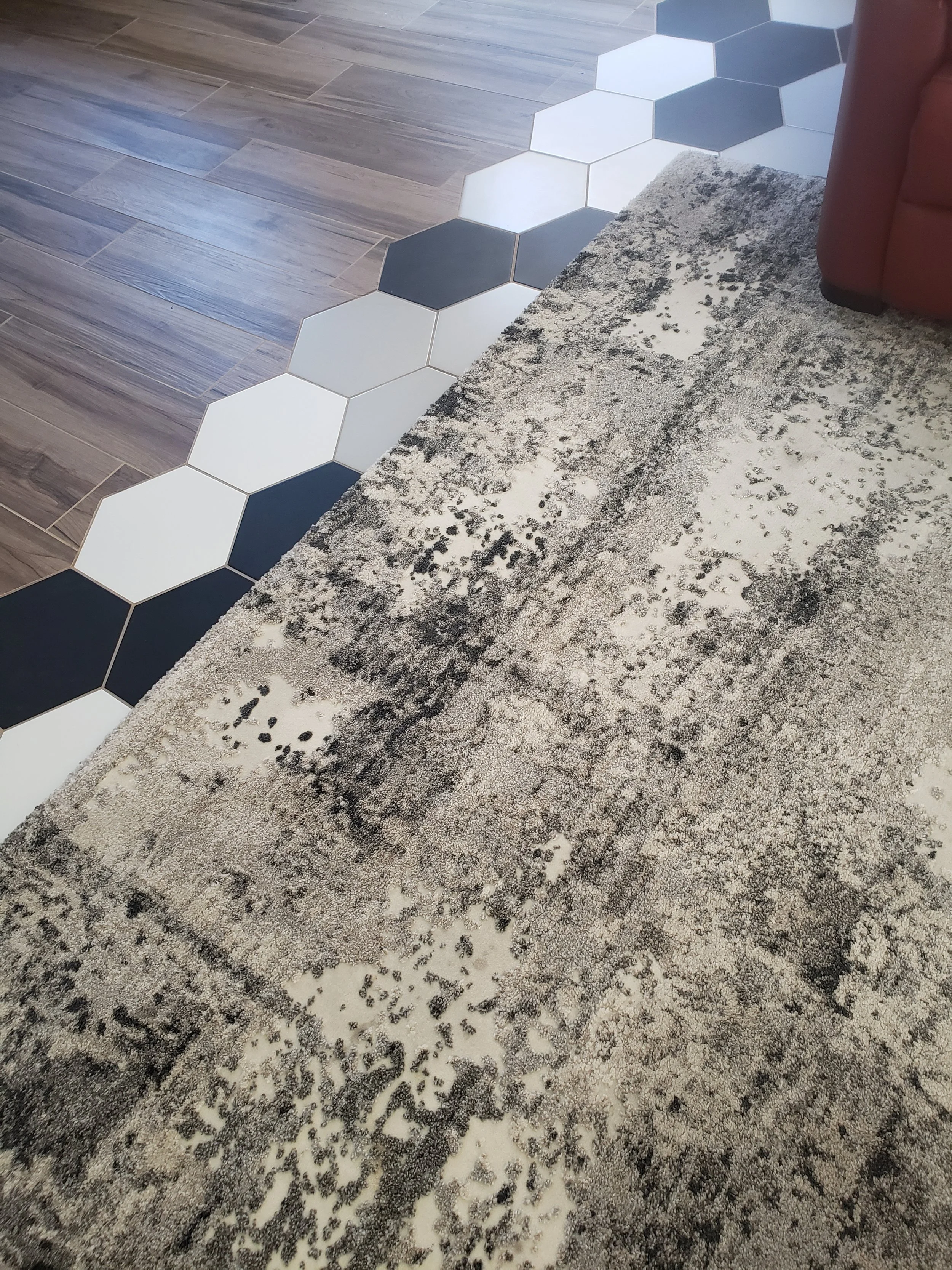 Mixing tiles with wood floor to fill in space once removed while adding black white and gray design to the floor while complimenting area rug being used in this great room family room area as well.