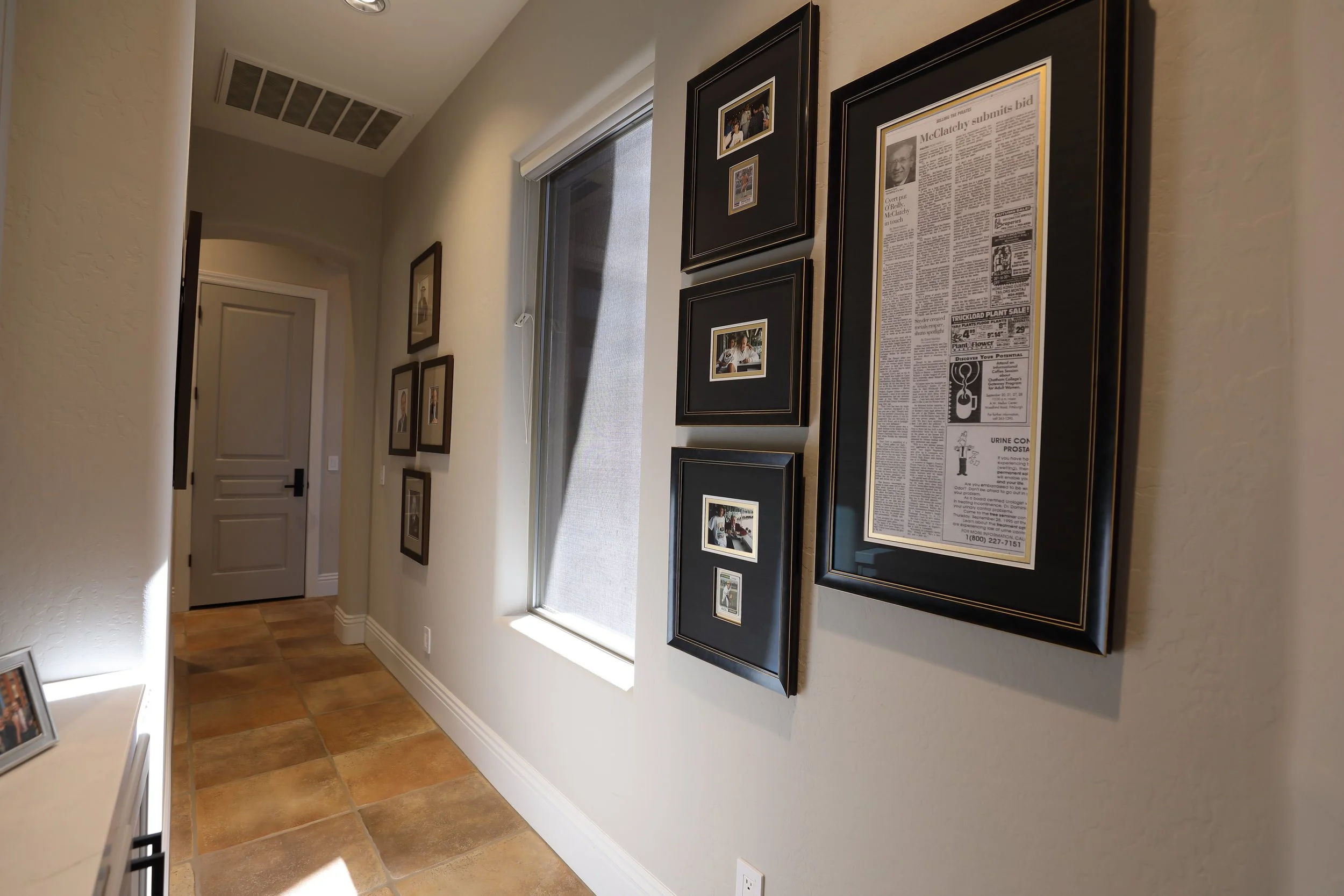 Personal memories framed in bold matting and alder wood frames compliments the rest of the home while framing a special article reminding Client of Father's history and special family events.