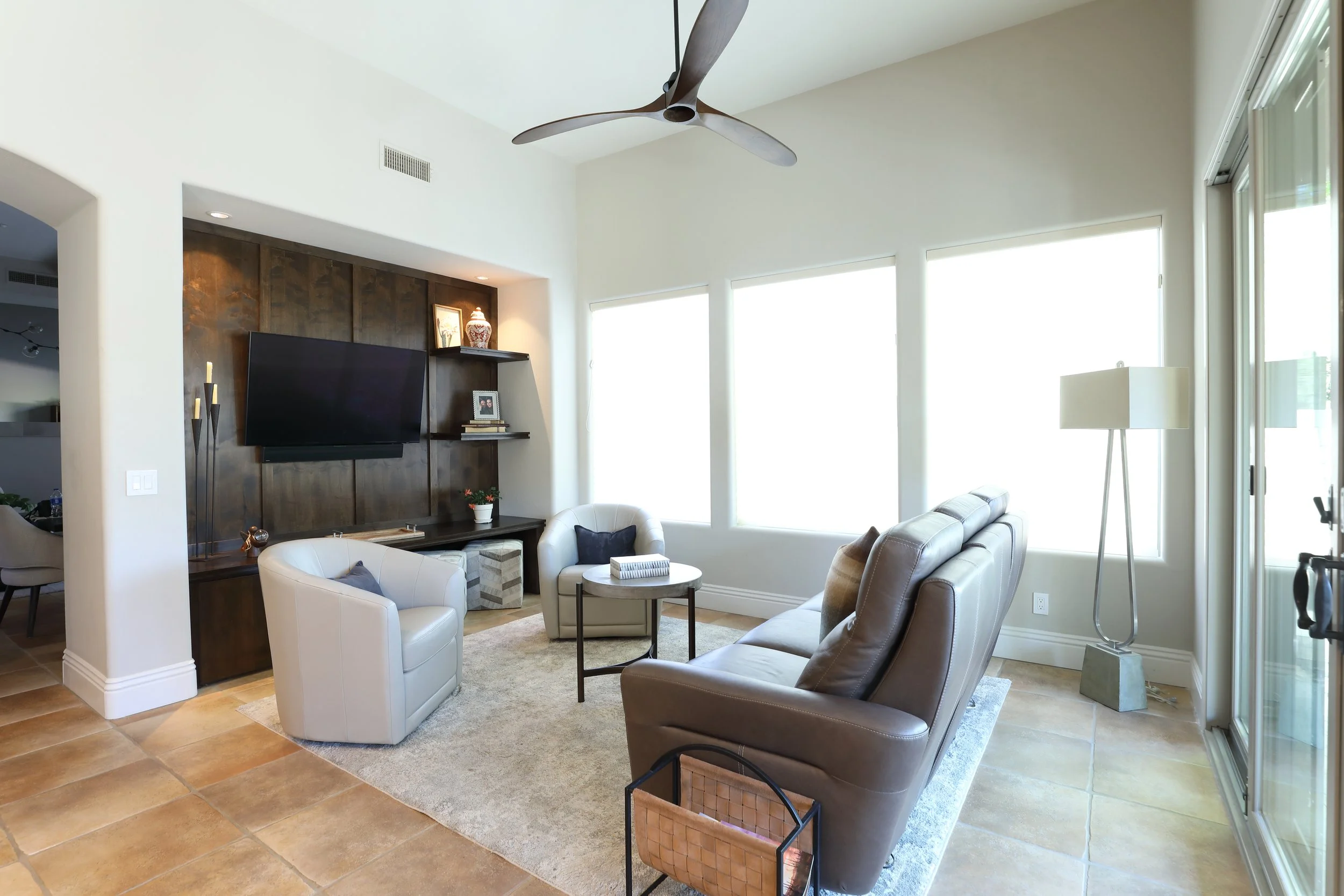 Contemporary family room with large oversized modular top grain leather carmel sofa accented with black and white pillows and cable knit throw blanket. Black and white coffee table and end tables offer all guests areas to sit drinks and indoor/outdoo