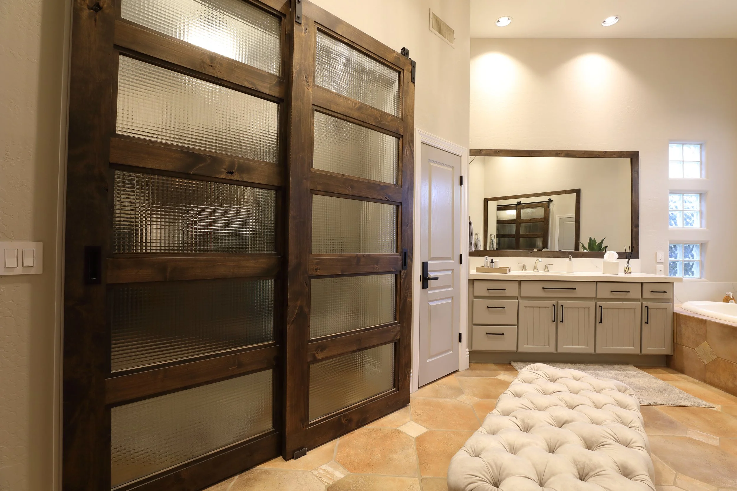 Custom alder wood and glass textured panes stained in ebony add architectural effect to the Master Bathroom and yet offer privacy behind closed doors in the Master Closet. Framed mirrors in same alder wood and plush, velvet cushioned bench sits betwe