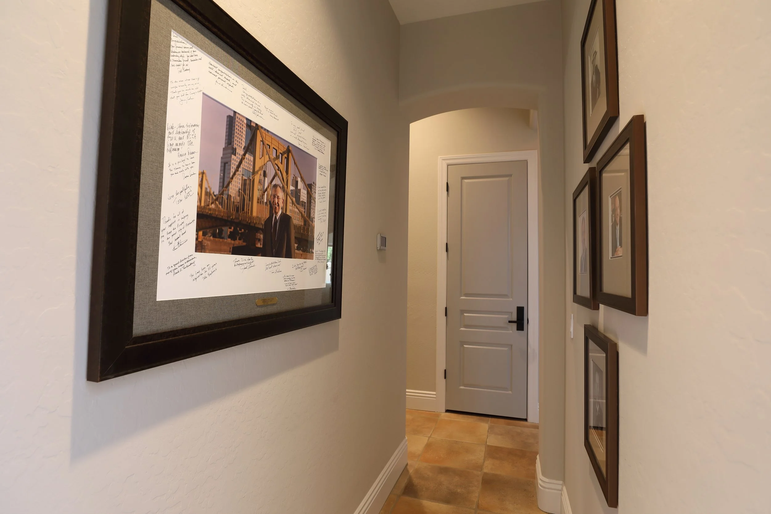 Gallery wall personalizes this hallway into special memories. Use of balance and innovative, creative ways of positioning framed pictures adds to the feeling of a special gallery experience.