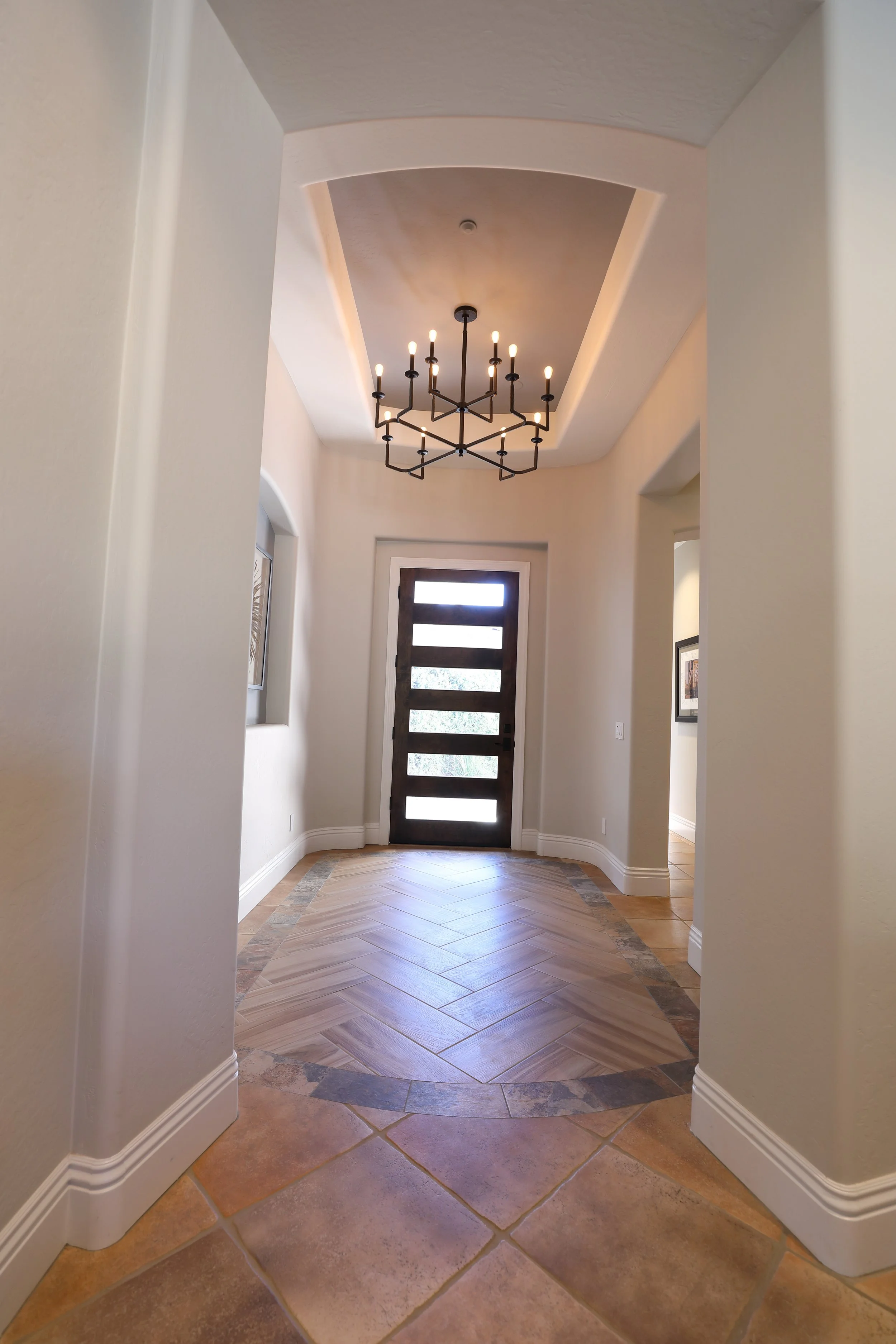 Alder Wood and Glass Paneled oversized Front Door makes a great first impression from the exterior to the interior entrance of this Southwest Contemporary home. Neutral greige walls with blue gray accent colors in niche and on ceiling inset are contr
