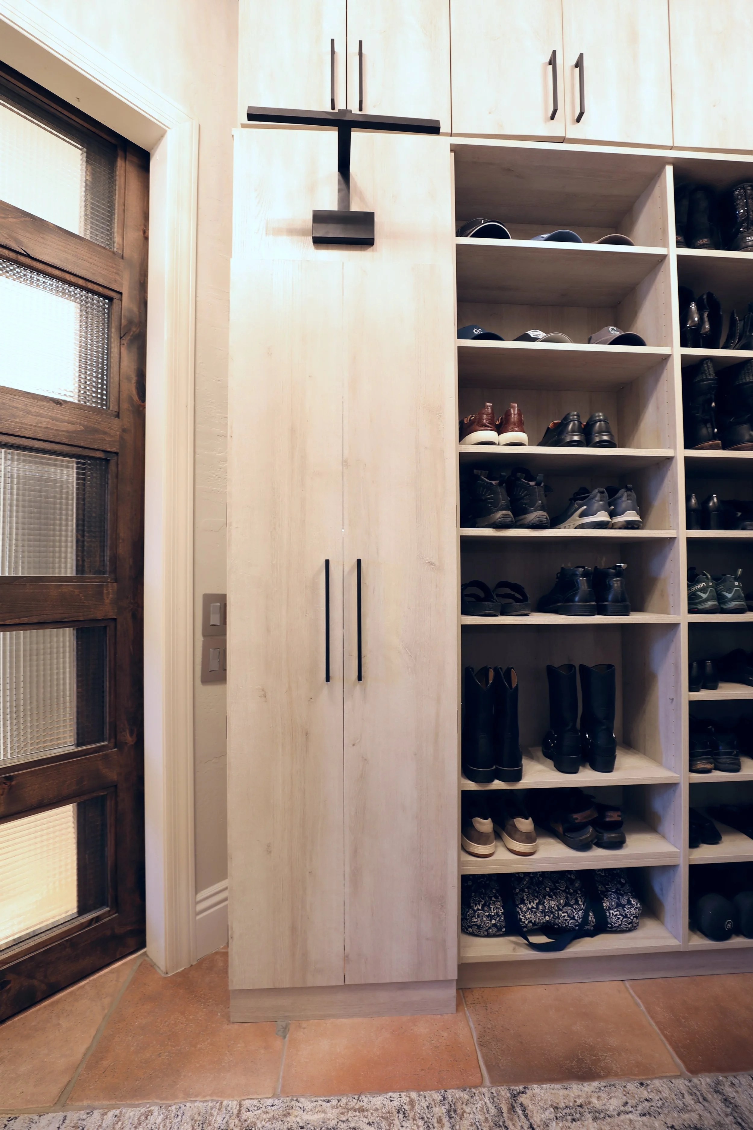 Use of foot covering shelves, closed cabinet storage, drawers and hanging space keeps this look light and bright and offers multiple closet options in one small space.