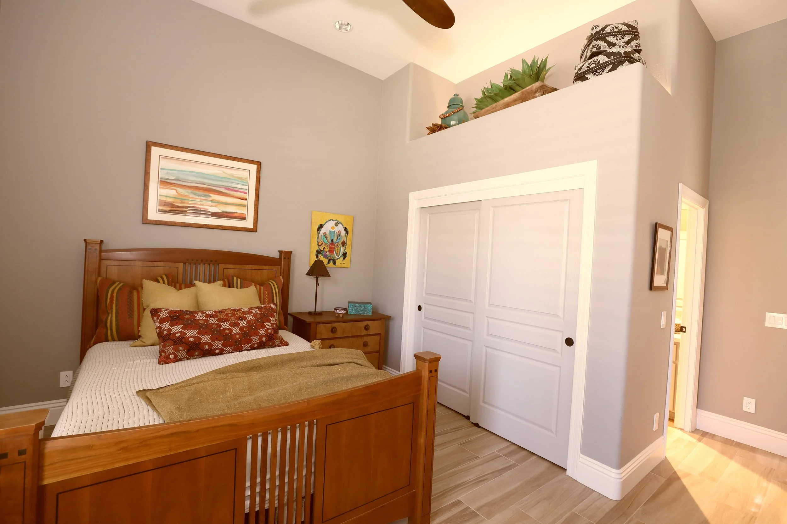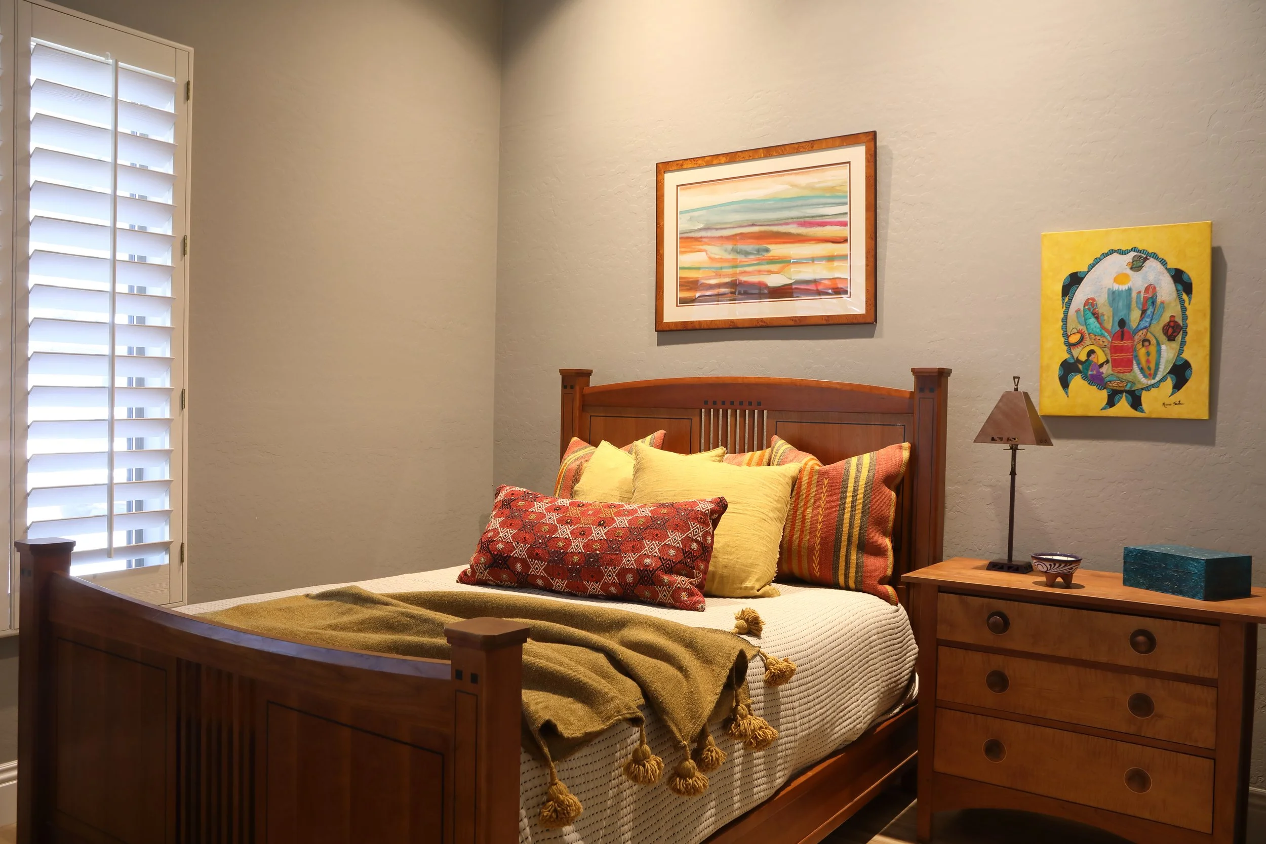 South of the Border styled guest bedroom with shaker bedroom ensemble. Copper metal light fixture and artwork sets the tone for southwest colors such as mustard throw with pom poms, orange and red with mustard accent pillows and turquoise jewelry box