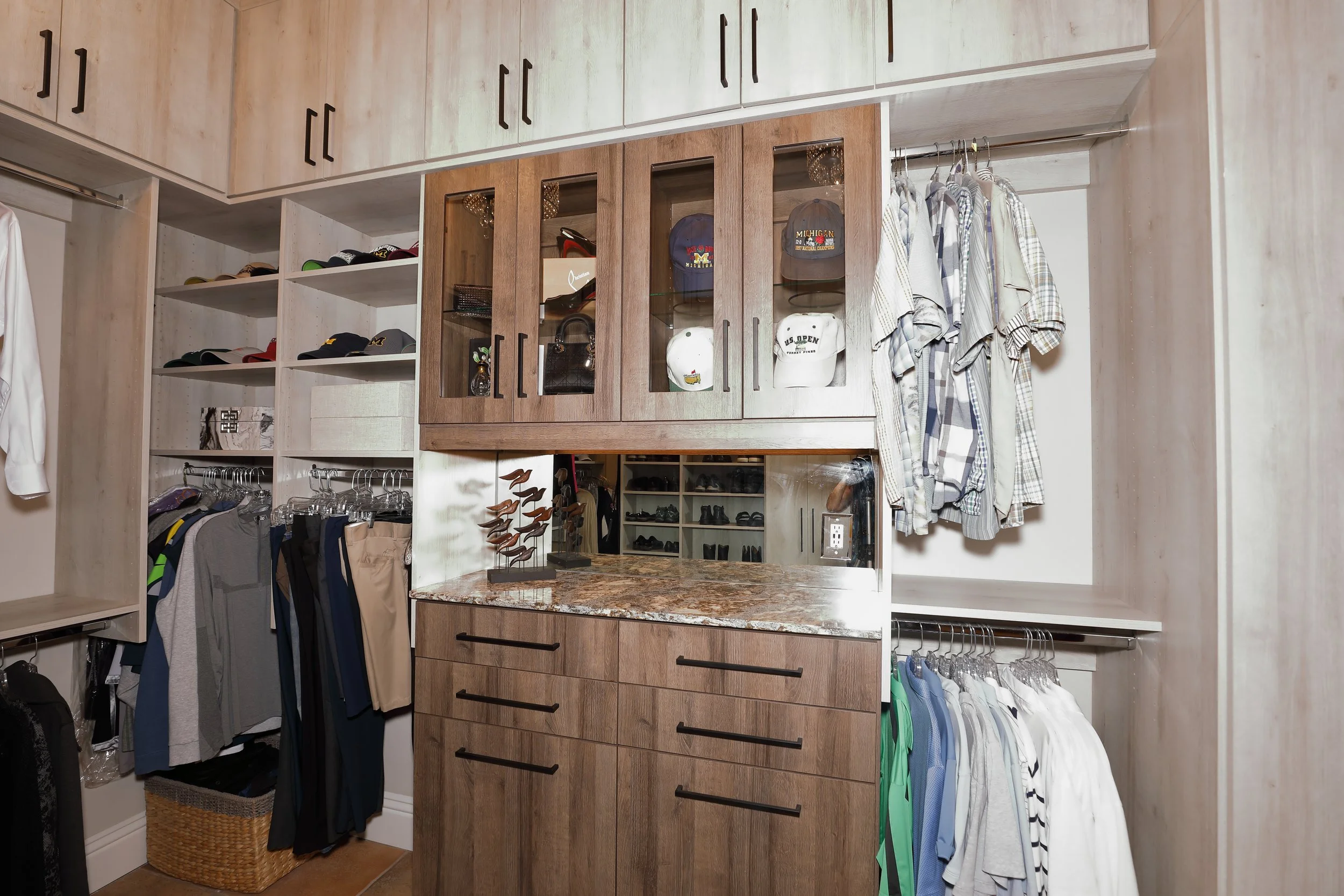 Master walk in closet with two toned wood style offering glass panels in cabinetry for display. Maple and oak combination with granite countertop ledge to set special items for dressing. Leather ottoman for comfort while putting on shoes, 3 paneled m